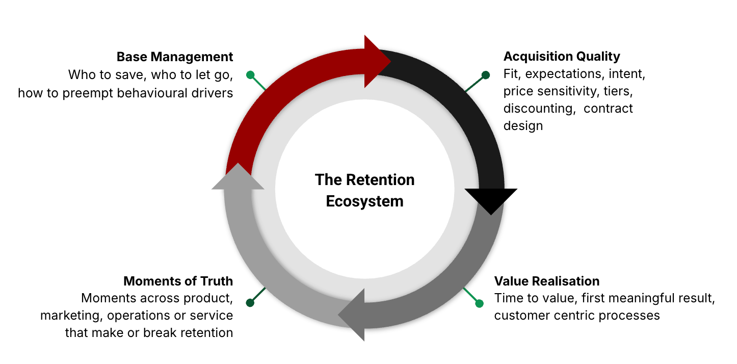 But retention is not driven by messaging alone; it is a function of how acquisition, commercial mechanics, product, value realisation, service, and lifecycle interact within the retention ecosystem.